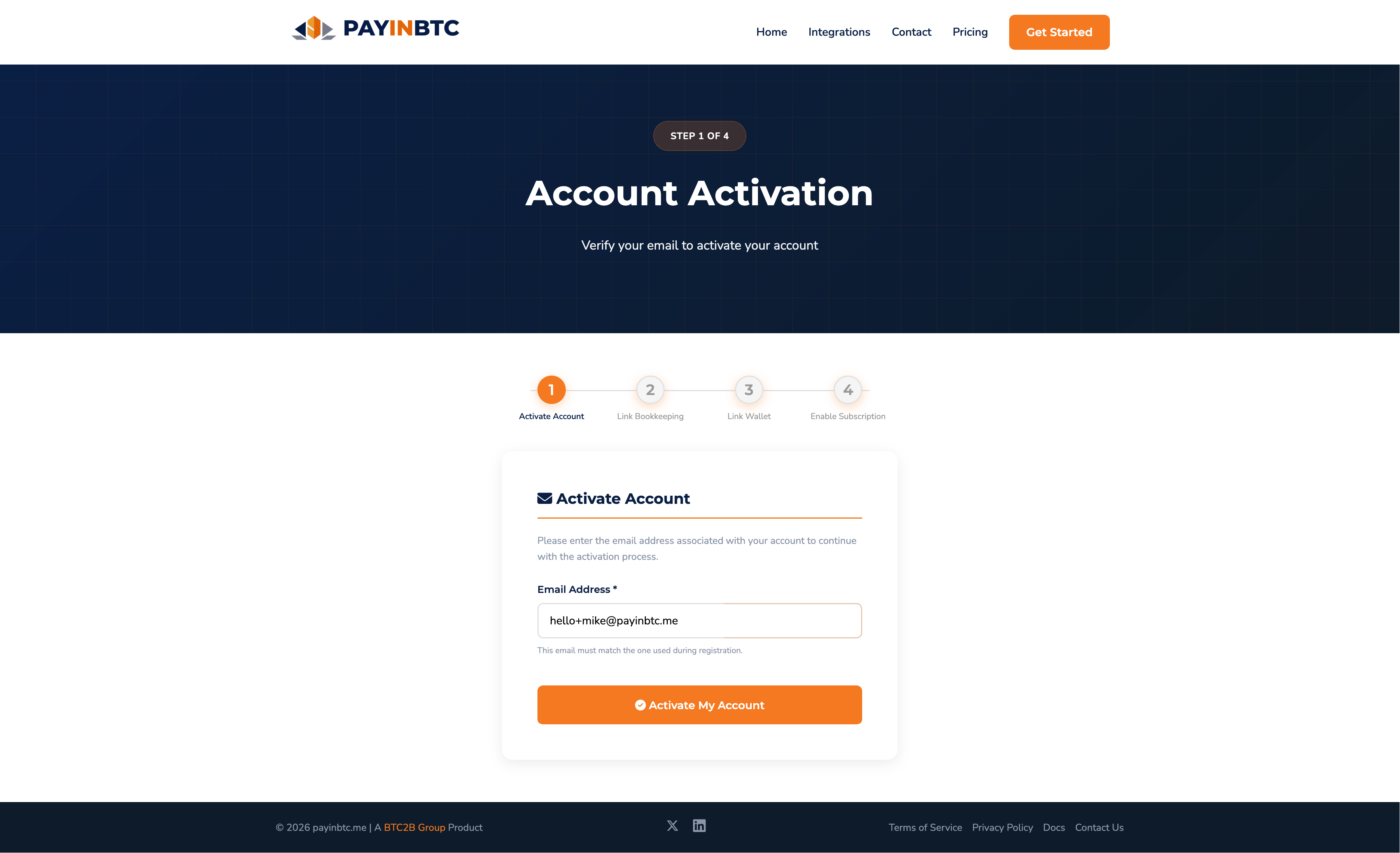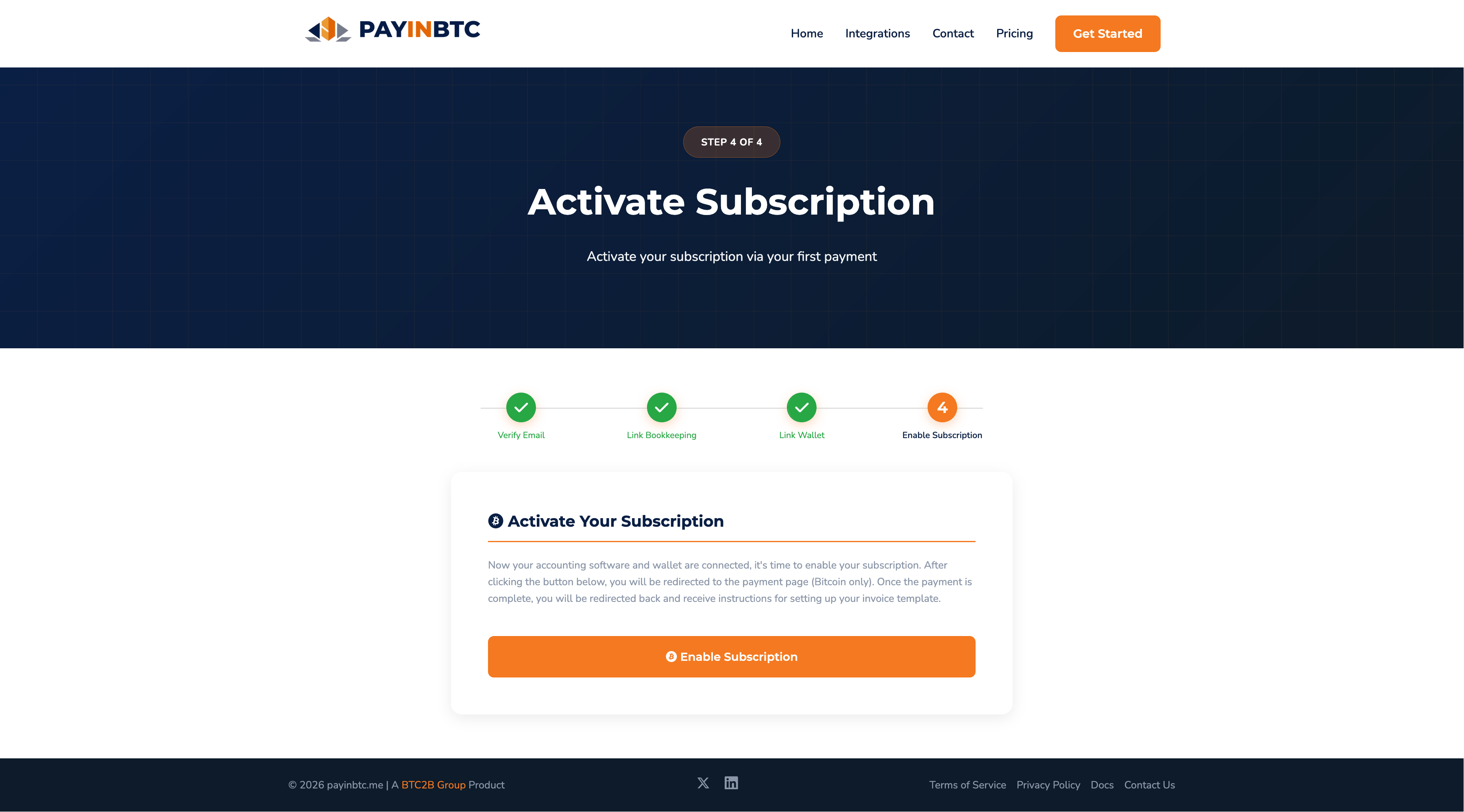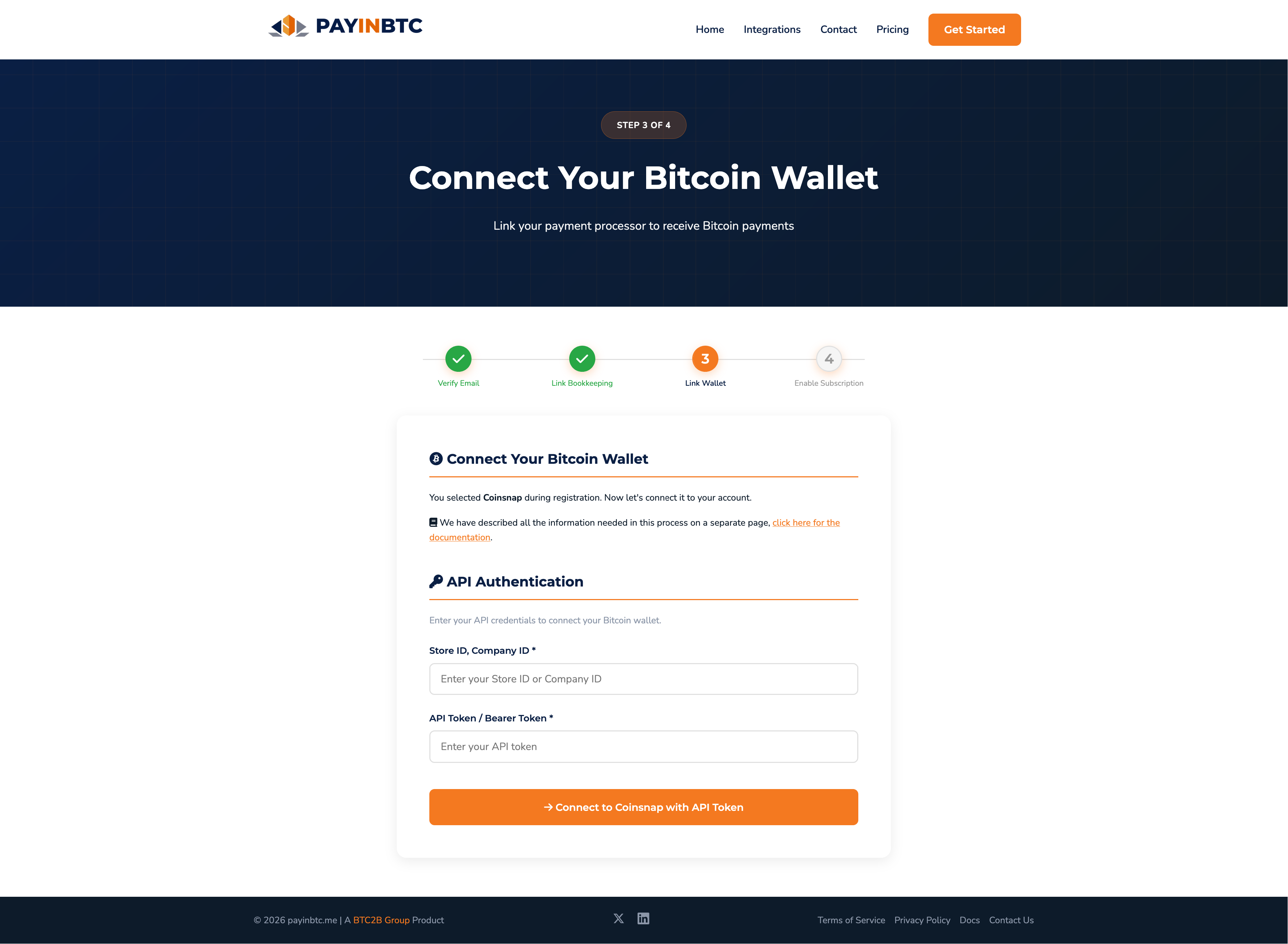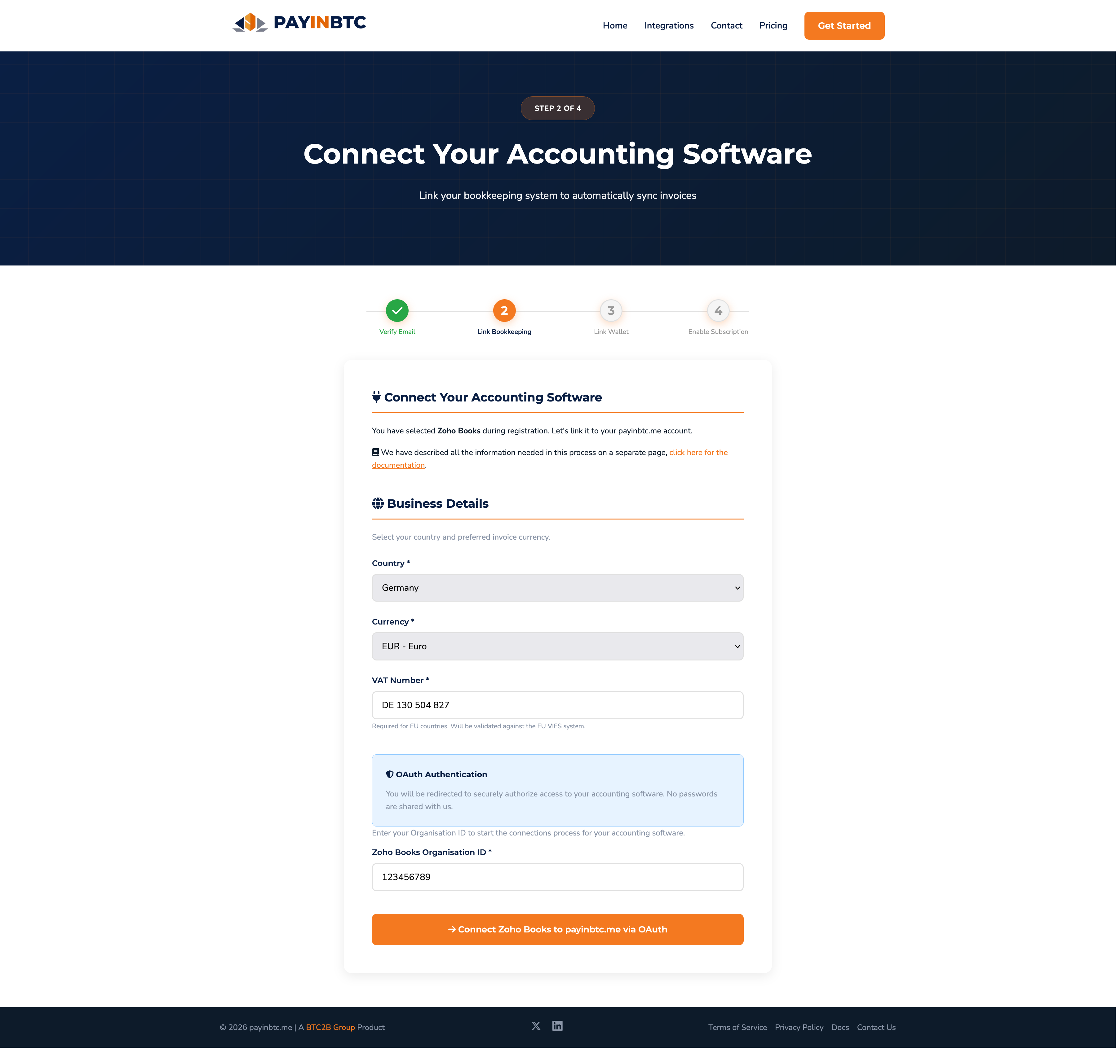 The next step is connecting your accounting software to the platform. We need to know your bookkeping currency, so we make sure the conversion to Bitcoin is done correctly. Since we are EU based, we need to verify you VAT status. Therfor we need your VAT number as well. We keep the amount of data stored to the bare minimum because we respect privacy.