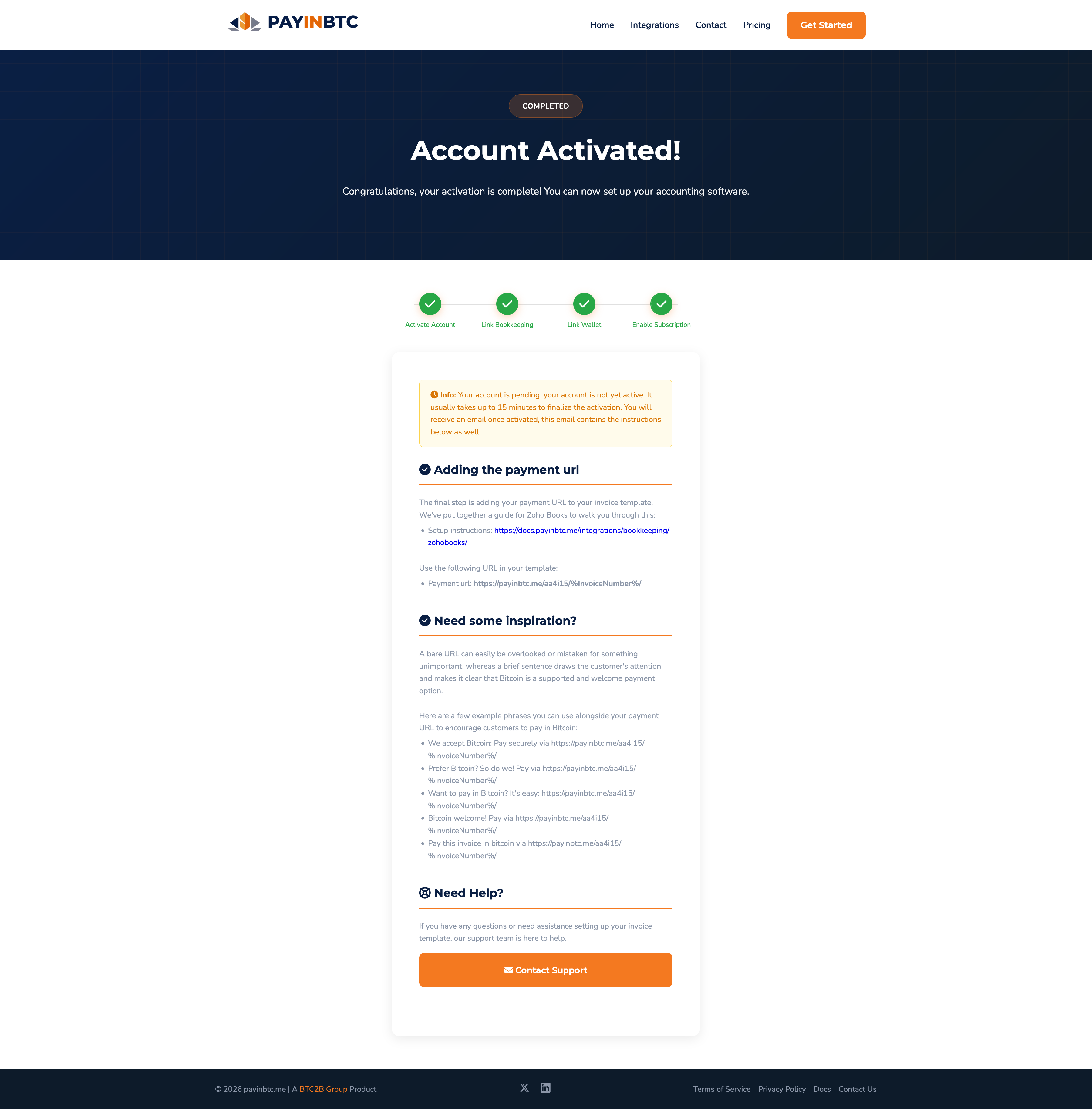 You will be redirected to the account activated page, confirming everything went well. Final step is to setup your invoice. Since this is different per accounting software we have described it on different pages. The account activation mail will include the link. To have an impression you can check the bookkeeping pages on this documentation site.