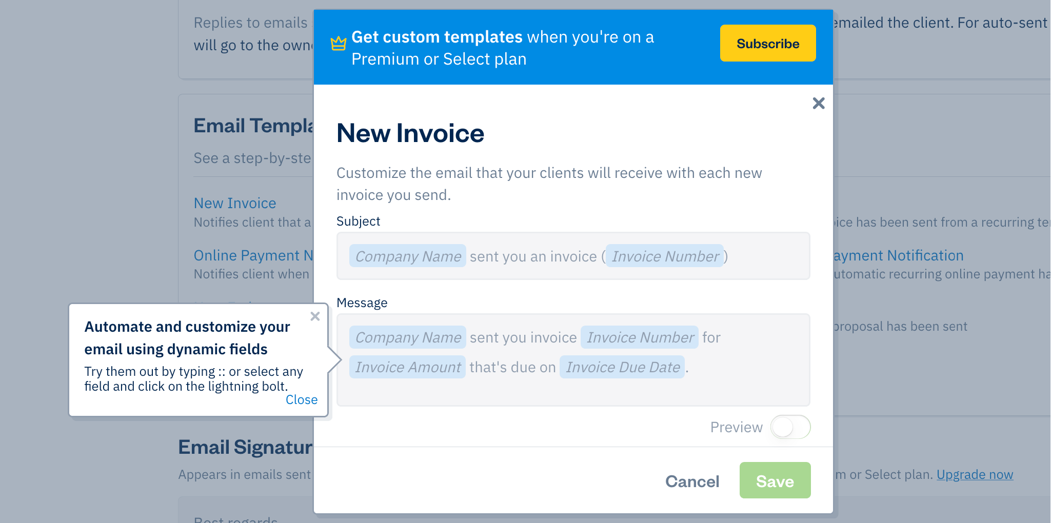 You need a Premium or Select subscription in FreshBooks to make use of dynamic variables in templates.
